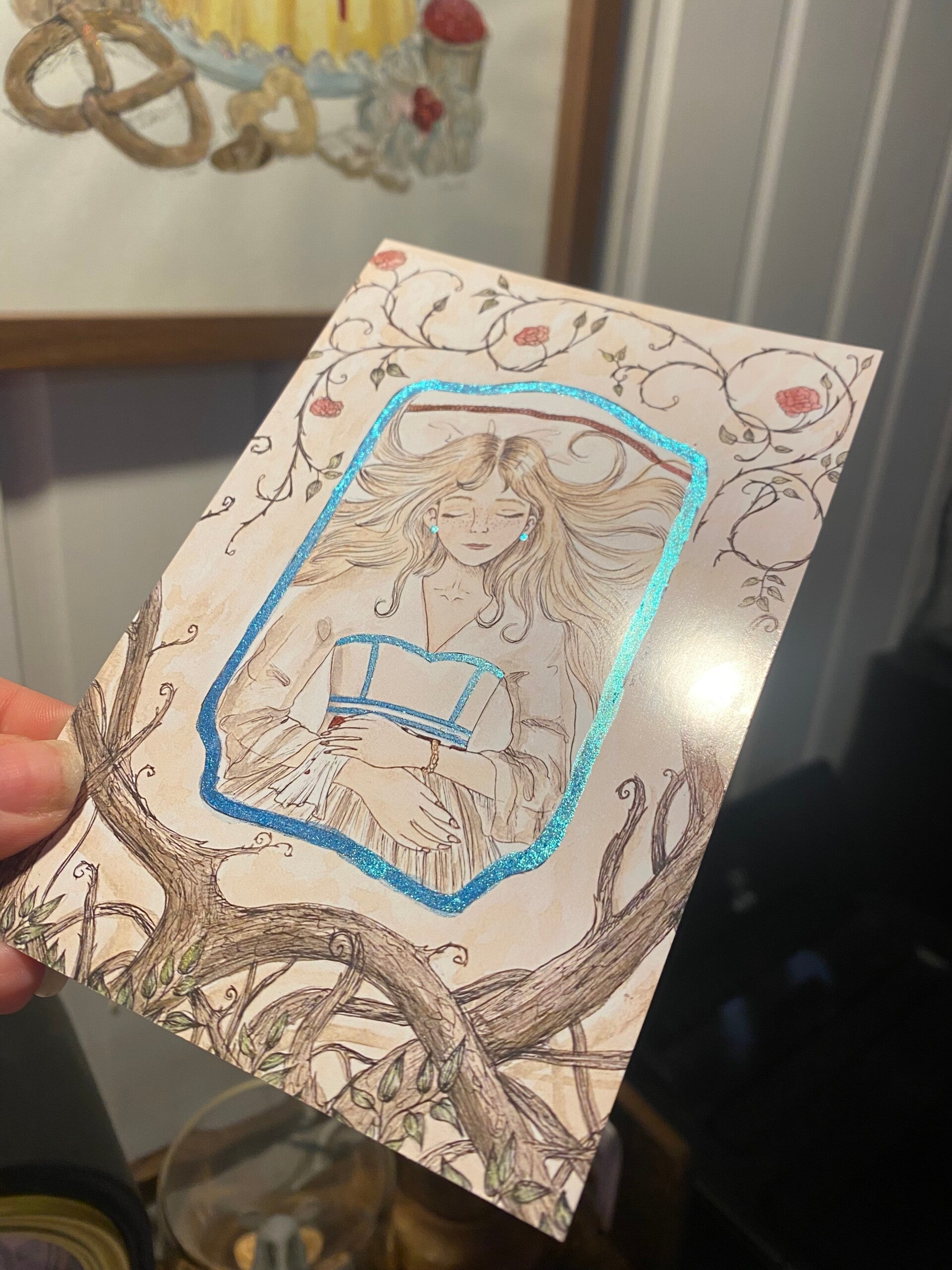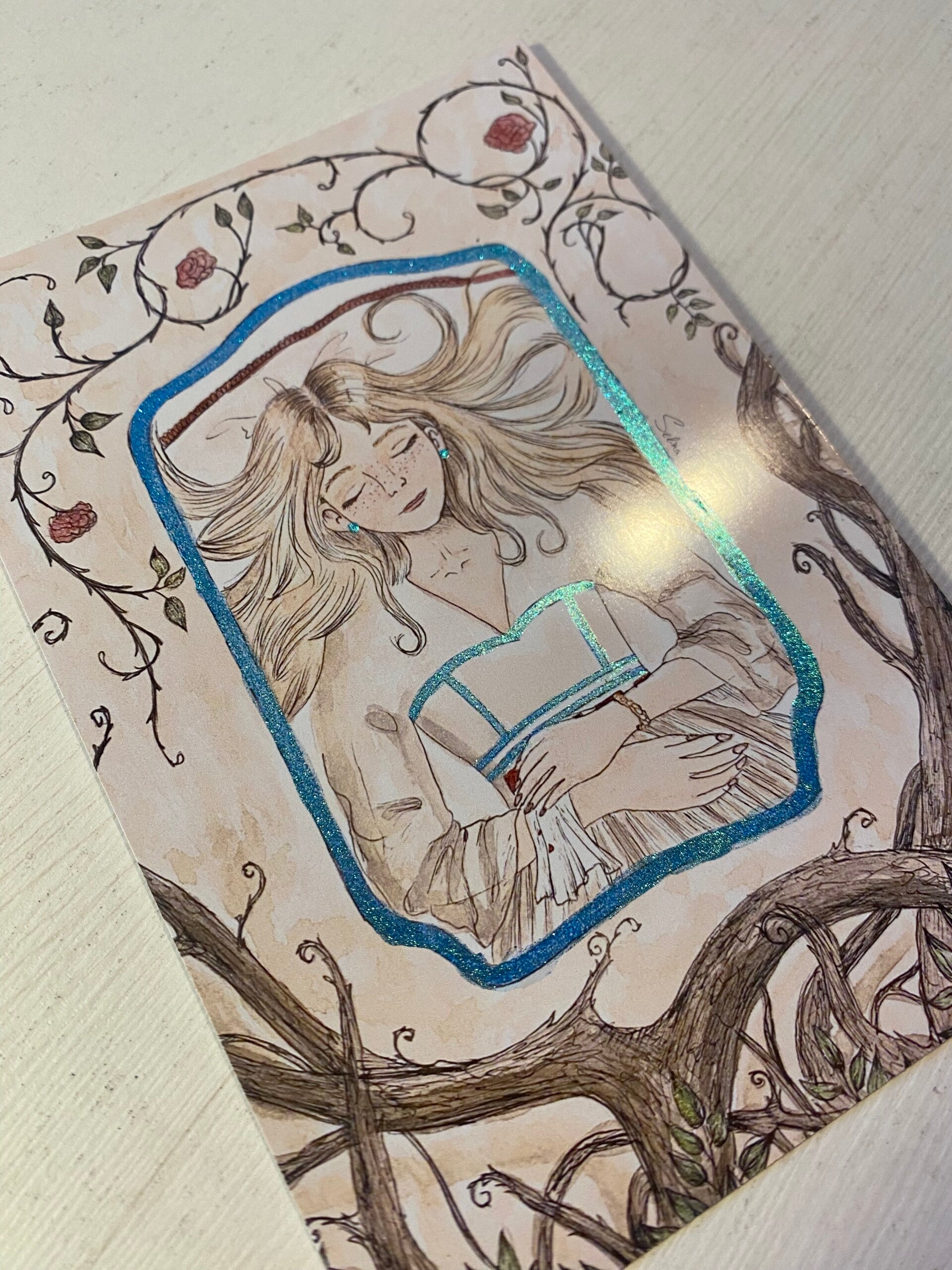 Deze betoverende illustratie van Doornroosje straalt zachtheid en sprookjesachtige magie uit. Subtiele glittereffecten brengen accenten aan in de illustratie en zorgen voor een fonkelende, luxe uitstraling. Een compacte kaart met een groot gevoel.